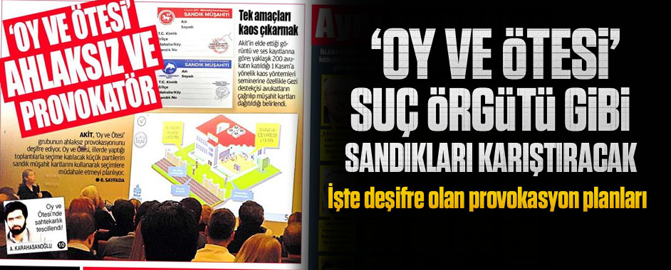 1 Kasım seçimlerinde “sandık müşahiti” kartlarıyla gayri resmi sandık bekçiliğine soyunan “Oy ve Ötesi” grubunun eylem planını Akit deşifre ediyor. Fetullahçı Terör Örgütü’nün (FETÖ) tüm unsurlarıyla desteklediği ve yönlendirdiği Oy ve Ötesi, illerde yaptığı toplantılarla seçime katılacak küçük partilerin sandık müşahit kartlarını kullanarak seçimlere müdahale etmeyi planlıyor. Seçime katılma hakkı elde eden FETÖ destekli bazı siyasi partiler de oy ve ötesi oluşumu kapsamında partilerine üye olmayan kişilere müşahit kartı vererek yasaları ihlal ediyor.