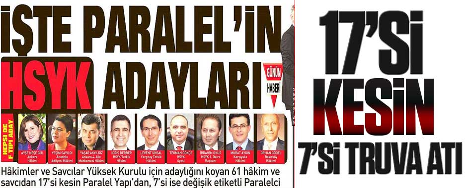 DIŞI BAĞIMSIZ İÇİ PARALEL: Bağımsız adaylar arasında paralel yapının desteklediği önemli isimlerin bulunduğu yargı çevrelerinde en çok dile getirilen iddialar arasında. Gerçekten bağımsız olan adayların arasına sızan paralel bağlantılı grupta, mevcut HSYK üyeleri Teoman Gökçe ve Ahmet Berberoğlu, Ankara Hâkimi Ayşe Neşe Gül ve HSYK Tetkik Hâkimi İdris Berber gibi isimler olduğu belirtiliyor. Yaşar Akyıldız, İlker Çetin, Orhan Gödel, Mehmet Kaya, Yeşim Sayıldı, Hasan Ünal, Ali Bilen, Hüsnü Çalmuk, Mahmut Şen, Saadettin Kocabaş’ın adı da yargı çevrelerinde paralel yargıyla birlikte anılıyor. Kendilerini “ne cemaat ne hükümet” sloganıyla tanıtan bir grup bağımsız adayın da paralel yapıdan oy desteği alabileceği değerlendiriliyor. Bu isimler de HSYK Birinci Daire Başkanı İbrahim Okur, HSYK 2’nci Daire Başkanı Nesibe Özer gibi bilinen adaylarla simgeleştiriliyor.