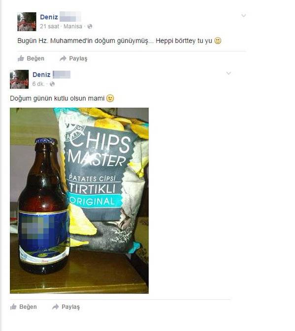 Hazreti Muhammed’in doğduğu gün olan Mevlit Kandili’nde şaşırtan paylaşımlarda bulunan D.B.’un sözleri sosyal medyada yayıldı. Bulut’un “Bugün Hz. Muhammed’in doğum günüymüş… Heppi börttey tu yu’, ‘Doğum günün kutlu olsun Mami” şeklinde yanında alkol fotoğrafı olan paylaşımlarda bulunması tepkilere yol açtı.