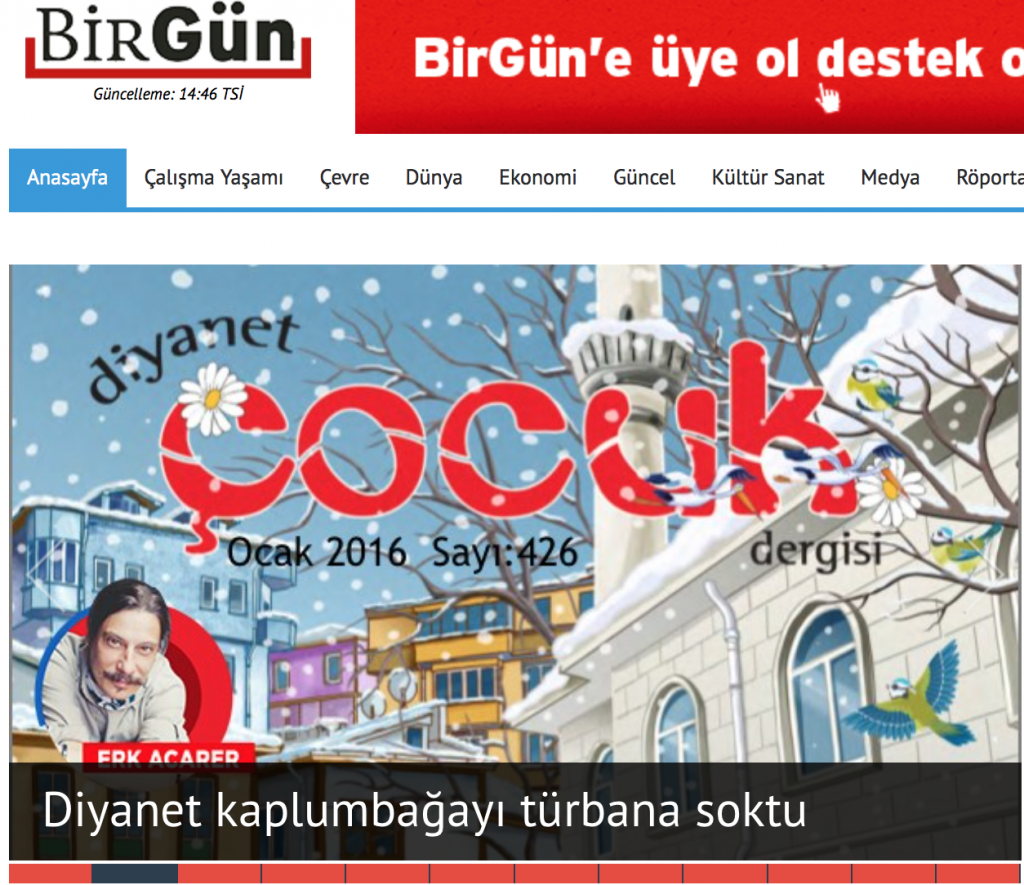 Türkiye’de bugün Fetocu terör örgütünün kullanışlı gazetesi haline gelen sözde solcu Birgün, iktidara tuhaliflik sosuna batırılmış İslam nefretini açık ediyor. Bu kez de Diyanet Çocuk dergisinde yayınlanan bir öyküdeki yaşlı babaanne kampumbağayı göstermek için kullanılan karikatürdeki örtüden “türban düşmanlığı” çıkardılar. Birgün’ün kaplumbağa kadar akıl olmayan haberini Sözcü de kullandı. İşte İslam düşmanlığında karikatürdeki bir kaplumbağanın örtüsüne kadar düşen nefretin ibretlik yansıması…