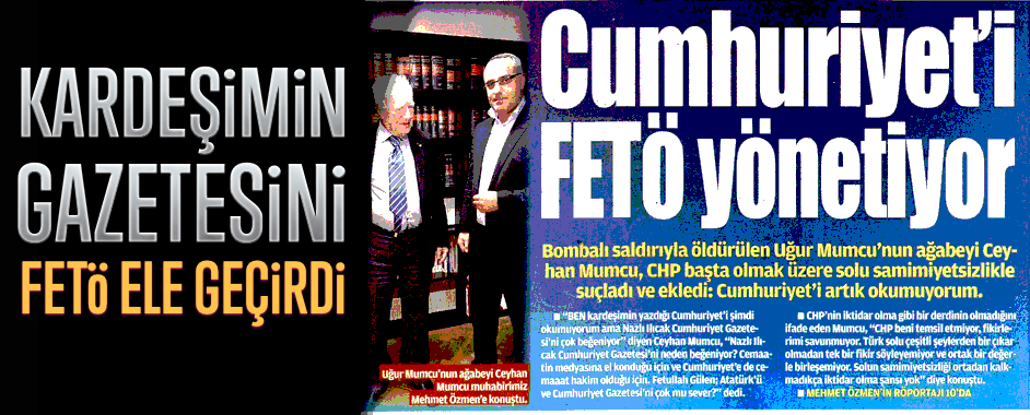 Bombalı saldırıyla öldürülen Uğur Mumcu’nun ağabeyi Ceyhan Mumcu, sol kesime yönelik ağır eleştirilerde bulundu. Yeni Akit’e konuşan Mumcu, “Ben kardeşimin yazdığı Cumhuriyet’i şimdi okumuyorum ama Nazlı Ilıcak Cumhuriyet Gazetesi’ni çok beğeniyor. Nazlı Ilıcak, Cumhuriyet Gazetesi’ni neden beğeniyor? Cemaatin medyasına el konduğu için ve Cumhuriyet’e de cemaat hakim olduğu olduğu için. Fetullah Gülen; Atatürk’ü ve Cumhuriyet Gazetesi’ni normal şartlarda çok mu sever?” dedi.