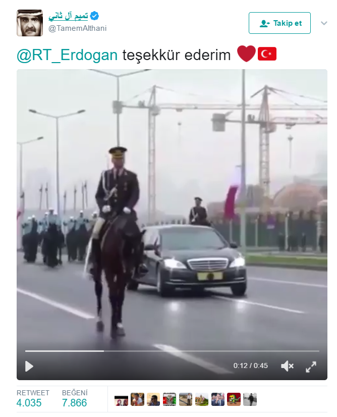 Katar Emiri Şeyh Temim bin Hamad Al Thani, resmi Twitter hesabından yaptığı paylaşımda, yayınladığı video ile Cumhurbaşkanı Recep Tayyip Erdoğan’a teşekkür etti.