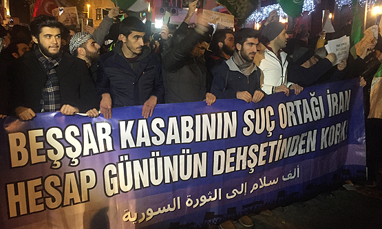 Gruptakiler, “İran ümmete hesap verecek”, “Katil İran, Suriye’den defol”, “Halep halkı yalnız değildir”, “Halep İran’a mezar olacak”, “Halep Sünnidir, Sünni kalacak” şeklinde sloganlar attı.
