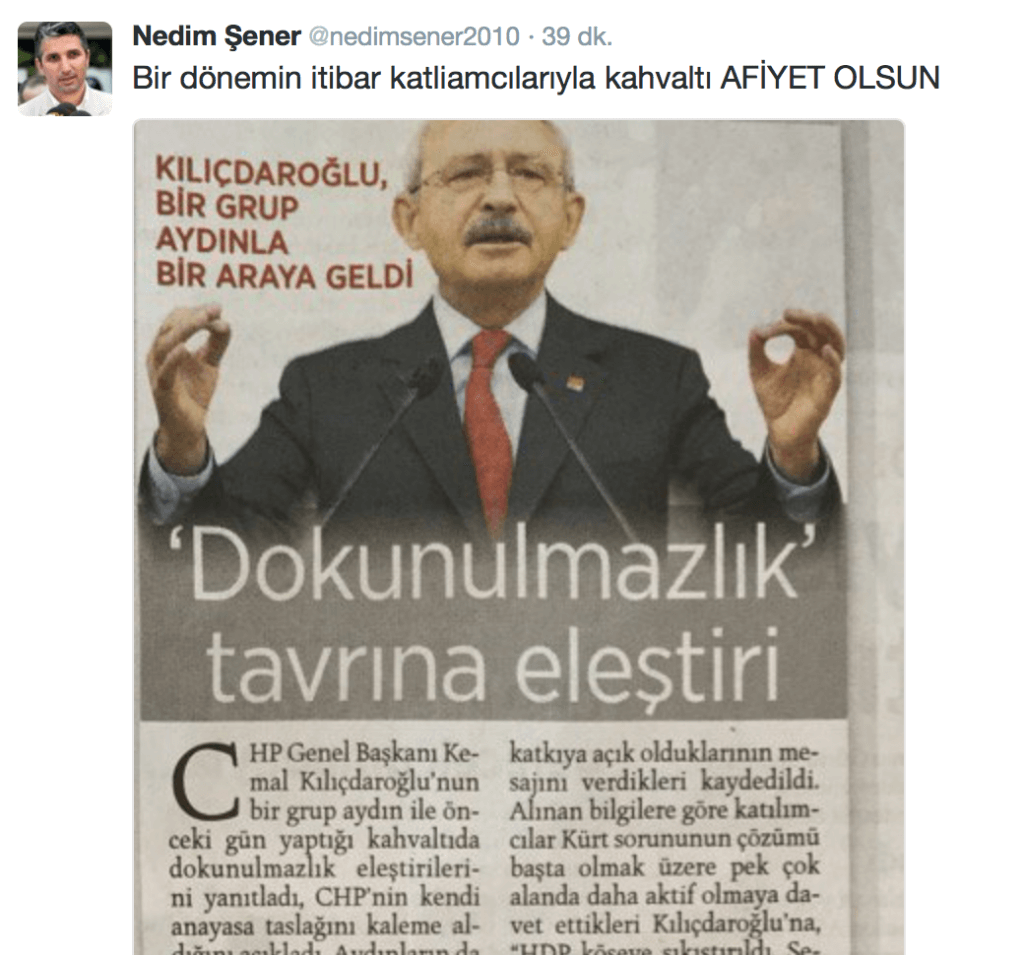 Kılıçdaroğlu’nun buluştuğu çoğunluğu paralel örgüte yakın 25 isim tartışma yarattı. Kılıçdaroğlu, önceki gün gazeteci ve akademisyenlerden oluşan bir grupla kahvaltıda buluştu. Kılıçdaroğlu toplantıda dokunulmazlık eleştirilerini yanıtladı, CHP’nin kendi anayasa taslağını kaleme aldığını açıkladı.