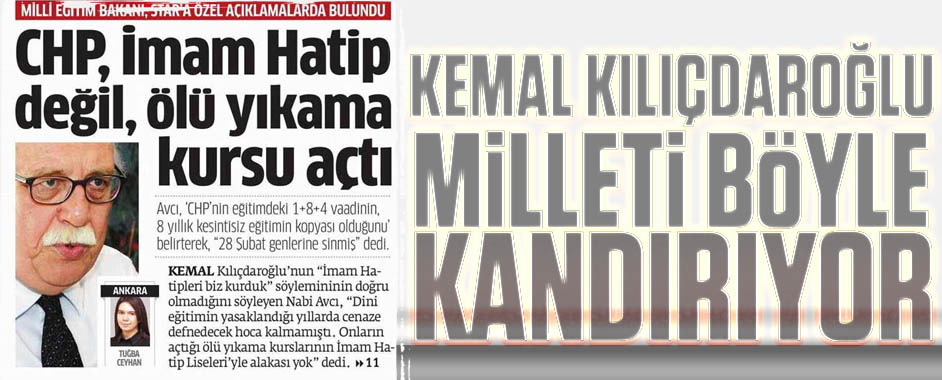 CHP Genel Başkanı Kemal Kılıçdaroğlu’nun, ‘İmam Hatip’leri kuran biziz’ söylemini eleştiren Milli Eğitim Bakanı Nabi Avcı, STAR’a yaptığı değerlendirmede, “Kılıçdaroğlu, gerçek niyeti kendince örtmeye çalışıyor. Ancak CHP’nin kurduğunu iddia ettiği ölü yıkayıcı kurslar, bugünkü İmam Hatip okulu değildi. Bunlar o dönemde dini eğitimin yasaklanması nedeniyle artık köylerde, kasabalarda dini hizmetlerin yerine getirilememesi, cenazeleri defin edecek hoca bulunamaması sebebiyle zorunlu olarak gündeme getirilmiş ölü yıkama kurslarıydı. Bugünkü imam hatiplerle onların hiç alakası yok. Bugünkü imam hatipler, adındaki bütün çağrışımlara rağmen normal lise eğitimi veren normal lise eğitiminin üzerine ayrıca bazı dini müfredat uygulayan kurumlardır… Zaten onun için bu kurumlar 28 Şubat sürecinde, ortaokul kısımları kapatılarak; önce katsayıyla, sonra başka baskı ve düzenlemelerle ortadan kaldırılmaya çalışıldı” görüşüne yer verdi.