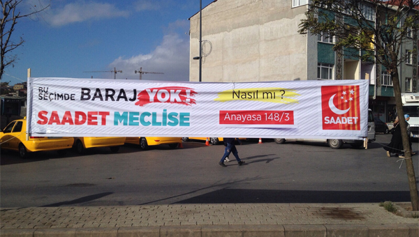Küçük partilere oy vereceğiz ama yüzde 10 barajını aşamazslarsa oyumuz boşa gidecek’ diye düşünen seçmenlerin kafasını karıştırmak için Saadet Partisi akıl almaz bir algı operasyonuna başladı. Saadet Partisi, ‘Bu seçimde baraj yok’ yazılı pankartları ülkenin değişik yerlerine asarak seçmenin kafasını karıştırma yoluna gitti.