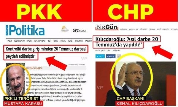 PKK elebaşısı Mustafa Karasu ile Kılıçdaroğlu aynı ağızdan konuşarak 15 Temmuz’u değil, OHAL’in ilan edildiği 20 Temmuz’u darbe olarak nitelendirdi. CHP Genel Başkanı Kemal Kılıçdaroğlu, 15 Temmuz FETÖ’cü darbe girişimiyle ilgili de PKK ile aynı dili kullanarak saldırılarına devam ediyor.