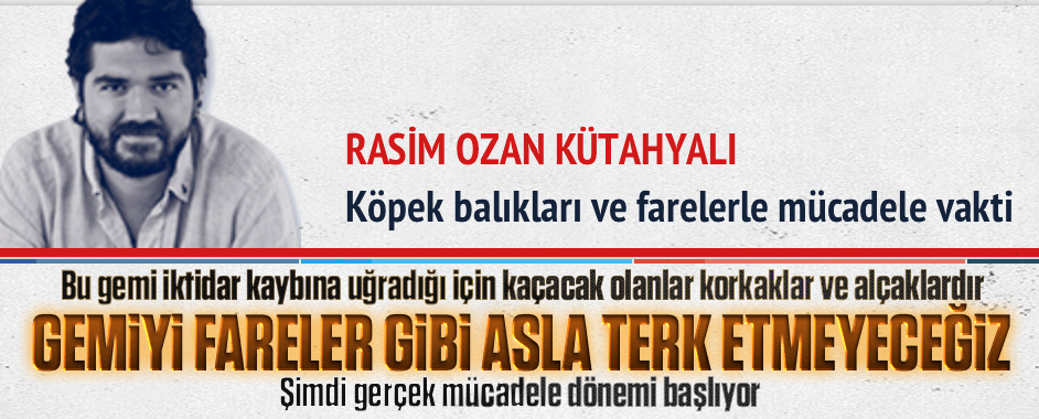 SABAH Gazetesi yazarı Rasim Ozan Kütahyalı bugün “Köpek balıkları ve farelerle mücadele vakti” başlıklı çarpıcı yazısında artık gerçek mücadele döneminin başladığını yazdı. Yazısına gemiyi terkeden farelerle de savaşılacağını yazan Kütahyalı, “Asla Gemi’yi terk etmeyeceğiz ve köpek balıklarıyla olduğu kadar farelerle de savaşacağız.” dedi. Yazısı şöyle:
