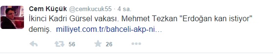 Star Gazetesi yazarı Cem Küçük de twitter hesabından konuyla ilgili yaptığı değerlendirmede ”İkinci Kadri Gürsel vakası. Mehmet Tezkan “Erdoğan kan istiyor” demiş” diyerek skandal yazıya tepki gösterdi.