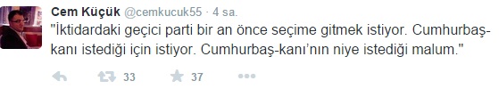 star.com.tr‘nin haberine göre, Tezkan yazısında ‘İktidardaki geçici parti bir an önce seçime gitmek istiyor..Niye istiyor? Cumhurbaş-kanı istediği için istiyor.. Cumhurbaş-kanı’nın niye istediği malum..’ ifadelerini kullandı.