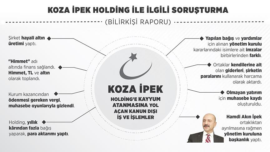 Ankara Cumhuriyet Başsavcılığının, Koza İpek Holding’e ilişkin soruşturması kapsamında alınan bilirkişi raporunda, şirketlerin “himmet” adı altında, kaynağı belli olmayan kayıt dışı paralarla finanse edildiği, şüphelilerin, şirkete ait olması gereken finansal değerleri ortaklarına verdikleri, olmayan yatırımlar için muhasebe kayıtları oluşturulduğu ve borsanın manipüle edildiğine yönelik bulgulara ulaşıldığı kaydedildi.