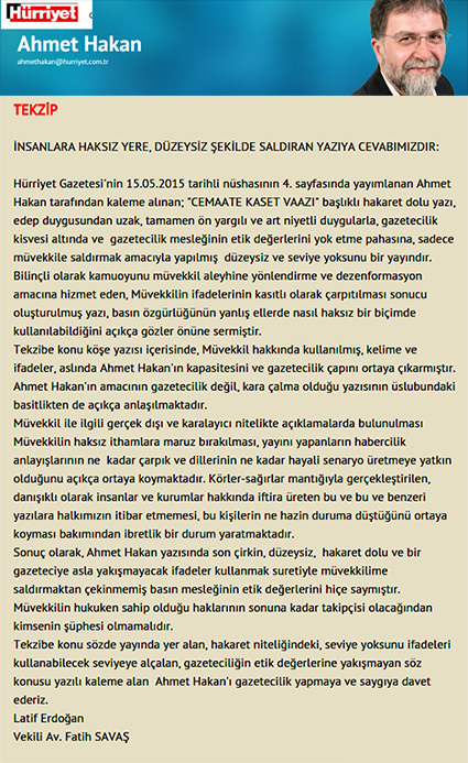 Hürriyet Gazetesi’nin 15.05.2015 tarihli nüshasında 4. sayfasında yayımlanan Ahmet Hakan tarafından kaleme alınan “cemaat kaset vaaz” başlıklı hakaret dolu yazı edep duygudsundan uzak, tamamen önyargılı art niyetli duygularla, gazetecilik kisvesi altında ve gazetecilik mesleğine etik değerlerini yok etme pahasına. sadece müvekkile saldırmak amacıyla yapılmış, düzeysiz ve seviye yoksunu bir yayındır.