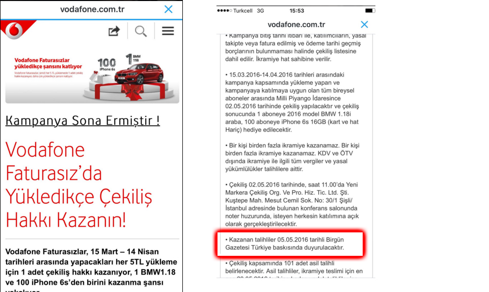 “Vodafone Faturasız’da Yükledikçe Çekiliş Hakkı Kazanın!” şeklindeki Vodafone Faturasızlar’a yönelik, “15 Mart – 14 Nisan tarihleri arasında yapacakları her 5TL yükleme için 1 adet çekiliş hakkı kazanıyor, 1 BMW1.18 ve 100 iPhone 6s’den birini kazanma şansı yakalıyor.” kampanyanın kazanan talihlileri sadece Birgün gazetesinde duyuruluyor.
