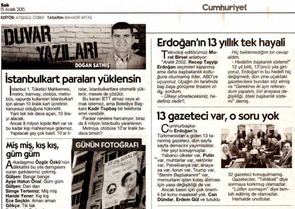 Cumhuriyet gazetesinde, daha önce imzasız olarak yayınlanan “Duvar Yazıları” adlı köşeyi, gazetenin Yayın Danışmanı Doğan Satmış’ın yazdığı ortaya çıktı.