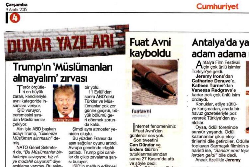 9 Aralık tarihli “Duvar Yazıları” köşesindeki “Fuat Avni kayboldu” ara başlıklı yazıda, Cemaat’in operasyonel sosyal medya hesaplarından Fuat Avni için “Oysa tam da bugünlerde, konuşması lazım” diye yazılması tartışma yaratmıştı.