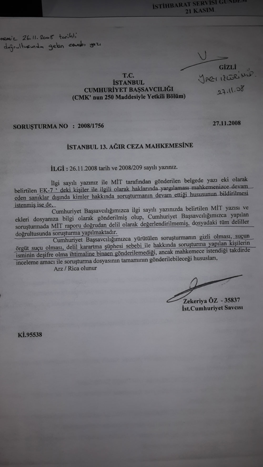 Aydınlık gazetesinden Sezim Özadalı’nın haberine göre; Zekeriya Öz, 27 Kasım 2008’de mahkemeye yazdığı yazıda “Cumhuriyet Başsavcılığımızca yürütülen soruşturmanın gizli olması, suçun örgüt suçu olması, delil karartma şüphesi sebebiyle hakkında soruşturma yapılan kişilerin isminin deşifre olma ihtimaline binaen göndermediğini” söyledi.