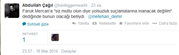 “Twitter’da sahte hesapla halletmeye çalışan bazı memurların olduğu konusunda ‘çekirdek’te ciddi şüphe var. Hatta sırf bu nedenle bazı toplantılarda, nasıl ve hangi hesaplardan sızacağı merakı ile yanlış bilgiler yem olarak kasıtlı ortaya atılıyor. Yakında bazı görevden almalar ve ilginç yer değişiklikleri duyarsanız bilin ki bu maskelilerden yakalananlar olmuş. Çünkü, iz sürülüyor.”