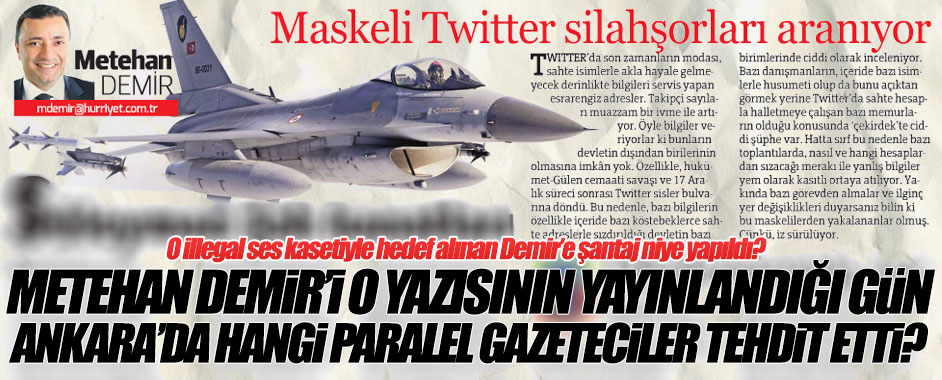 İşte bu yazısının yayınlandığı gün iddialara göre Gülen örgütü medyasında iki gazeteci Metehan Demir’i tehdit etti. Biri Zaman gazetesi Ankara’dan, diğeri de Kanaltürk Ankara ofisinden iki gazeteci Demir’e “şantaj” yaptı, sonra da olanlar oldu. Demir belli ki tehdite boyun eğmemişti. Peki kim o paralel gazeteciler? Birinin M.Ü. diğerinin de F.M. olduğu söyleniyor. Ve ne ilginçtir ki Metehan Demir’i tehdit edenler onun aynı zamanda Gülen örgütü kanalındaki program arkadaşları. İşte o tehditten sonra her ne olduysa Metehan Demir’e ses kaseti operasyonu çektiler.