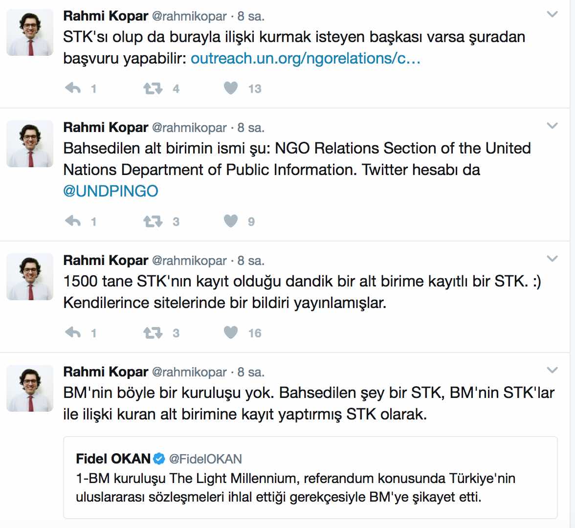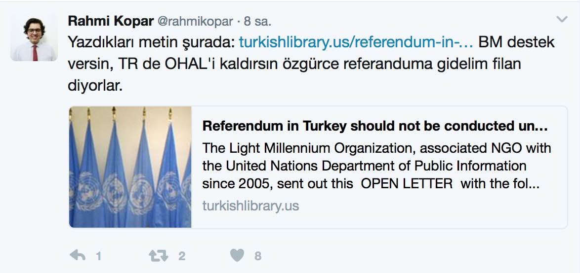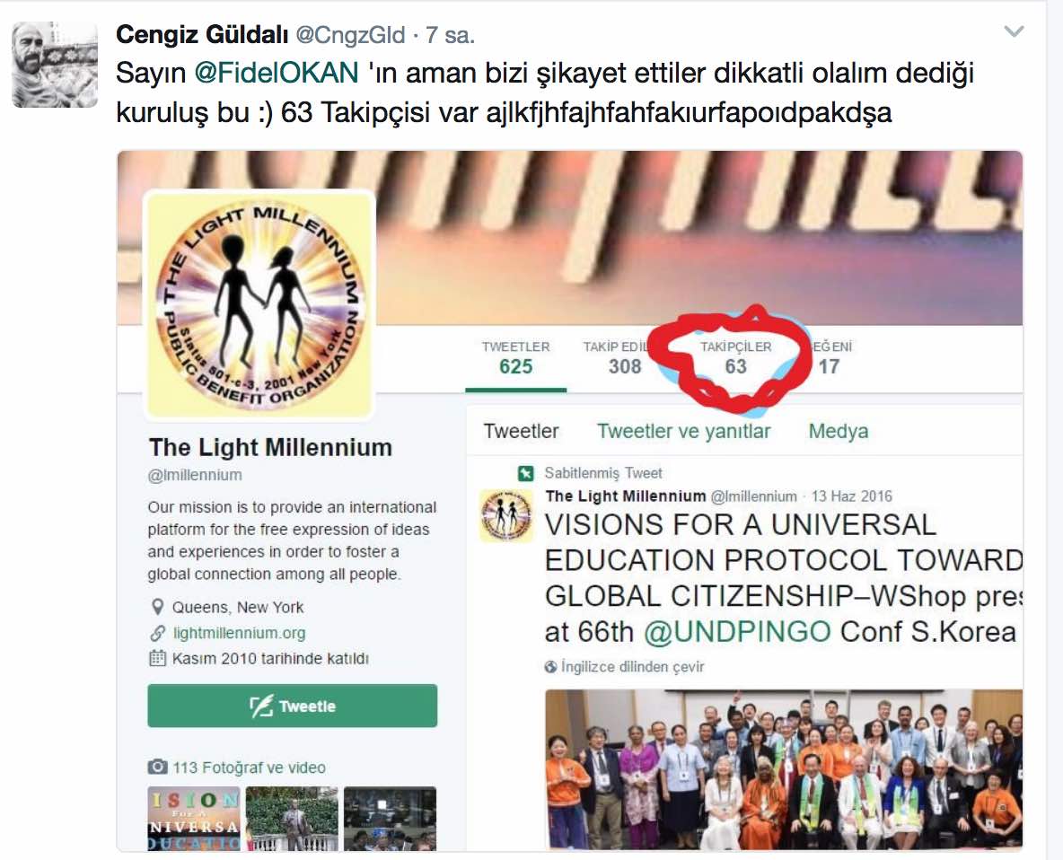 Okan’ın yalanı kısa sürede Twitter’da deşifre edildi. İlki The Light Millenium BM’ye ait bir sivil toplum kuruluşu falan değil. Hayırcı Okan’ın tüm derdi referanduma yönelik provokasyon yapmak.