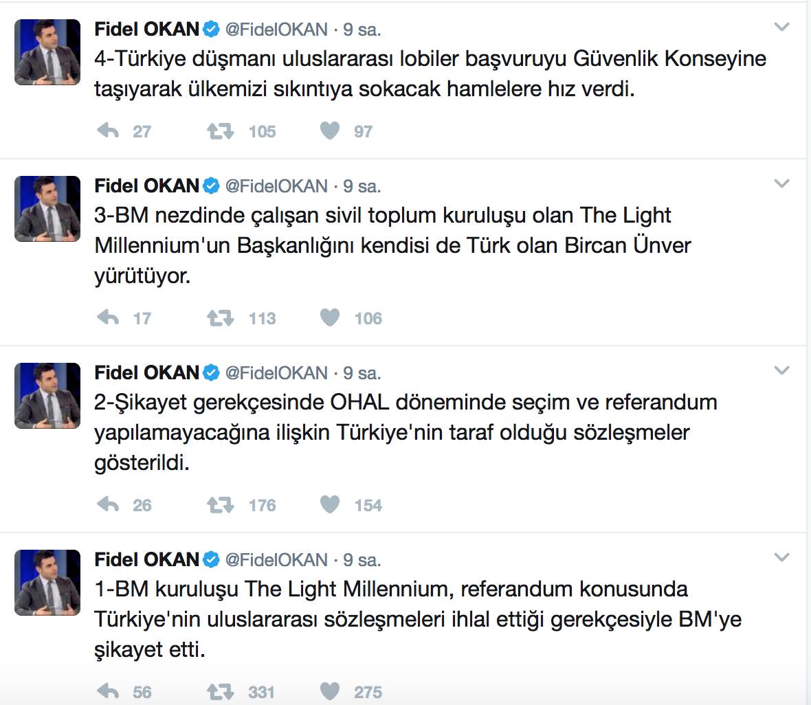 Erdoğan düşmanı, hayırcı, FETÖ karşıtı gibi görünüp tamamen FETÖ çıkarlarına hizmet eden Bay Mikser Fidel Okan, Twitter’da son iddialarıyla ortalığı karıştırmaya çalıştı. Okan, BM’ye ait bir siivl toplum kuruluşu olduğunu iddia ettiği The Light Millenium’un başvurusuyla Türkiye’de 16 Nisan’daki referandumun iptal edileceği gibi tuhaf yalanı sürüme soktu.