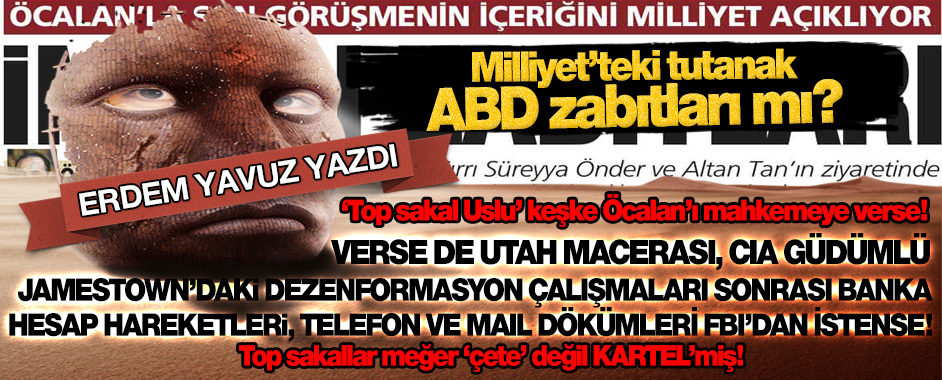 Bunun üzerine Abdullah Öcalan’ı mahkemeye vereceğini belirten “top sakal Uslu”, keşke sözünü tutup mahkemeye verse de, Utah macerası, CIA kontrolündeki Jamestone Vakfı için yaptığı dezenformasyon çalışmalarından sonraki banka hesap hareketleri, telefon, mail gibi görüşme dökümleri FBI’dan istense, mahkeme zabıtlarıyla ortaya çıksa, ABD zabıtları Namık Durukan aracılığıyla, büyük gazetecilik yapılarak Milliyet’te yayınlansa da, KARTEL’in nasıl örgütlü çalıştığı kamuoyu tarafından öğrenilse.