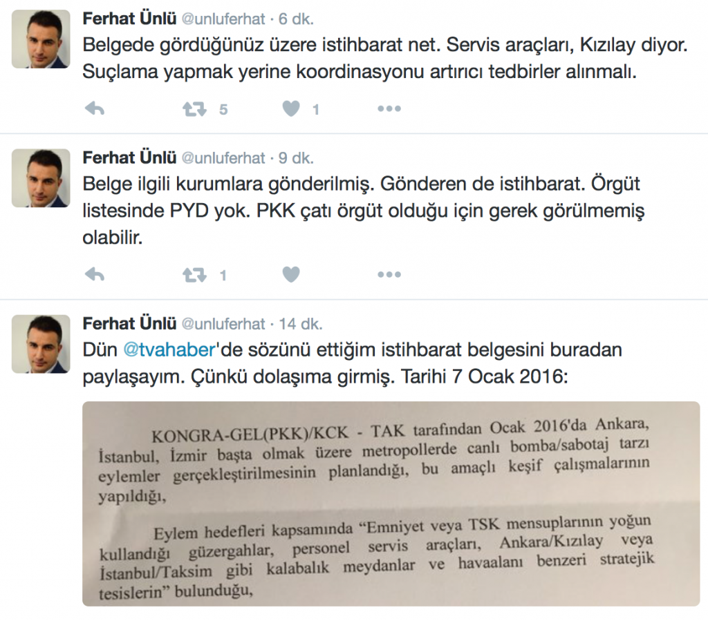 Ankara’daki terör saldırısının ardından istihbarat zaafiyeti olduğu tartışması başladı. Milli İstihbarat Teşkilatı’nın en son 7 Ocak 2016 tarihli yazısıyla, tüm kurumları PKK’nın olası saldırı hazırlıkları konusunda uyardığı ortaya çıktı. Üstelik o uyarıda, servis araçlarının toplandığı alanlar uyarısı da var.