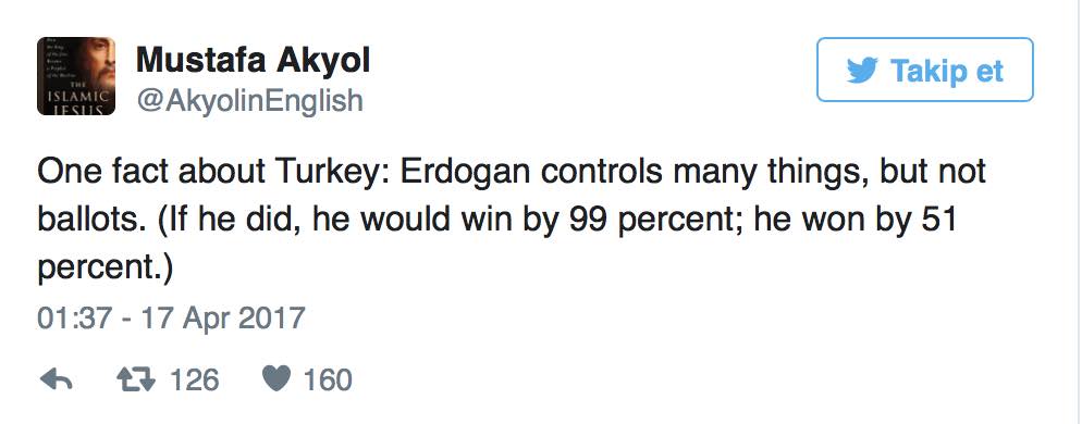 Uluslararası boyuta taşan tartışmalar hakkında İngilizce bir mesaj paylaşan Akyol, “Türkiye hakkında bir gerçek: Erdoğan çok fazla şeyi kontrol ediyor, ama sandıkları değil. (Eğer bunu yapsaydı, yüzde 99 oyla kazanırdı; sadece yüzde 51 ile kazandı.)” ifadelerini kullandı.