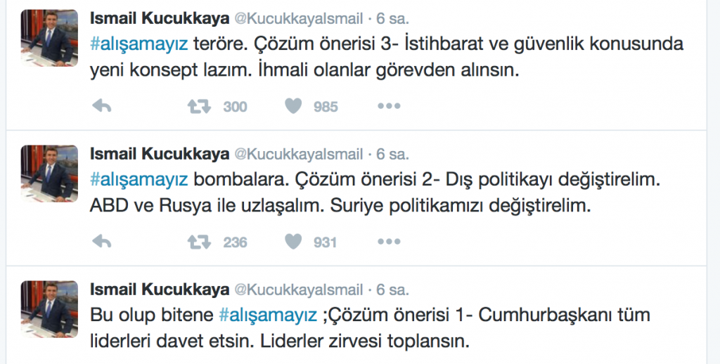 Ankara’daki terör saldırısının hedefi net…. Erdoğan ve Türkiye…. Türkiye’ye birşeyleri dayatıyorlar, Türkiye’ye istikamet vermek istiyorlar. İslam düşmanı siyonist Murdoch’ın Fox TV’sinin beslemesi İsmail Küçükkaya’ya bakın… Uluslararası gladyonun sözcüsü gibi Türkiye’nin yapması gerekenleri çözüm önerisi diye dayatıyor. Murdoch’ın adamının bu önerileriyle Ankara’da bomba patlatan fail aynı amaca hizmet ediyor.