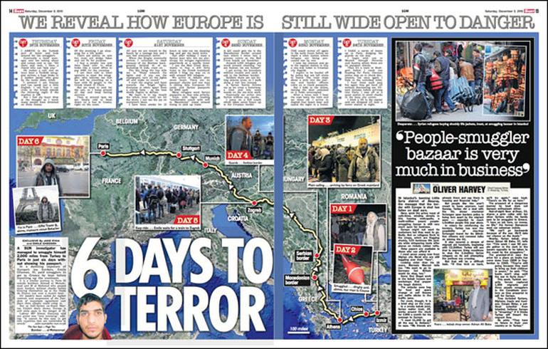 The Sun’da “Teröre 6 gün” başlığıyla çıkan haberde, kaçak göçmenlerin İstanbul’daki bir çarşıdan can yelekleri almasına ilişkin görüntüler dahil çok sayıda fotoğraf yayımlandı.