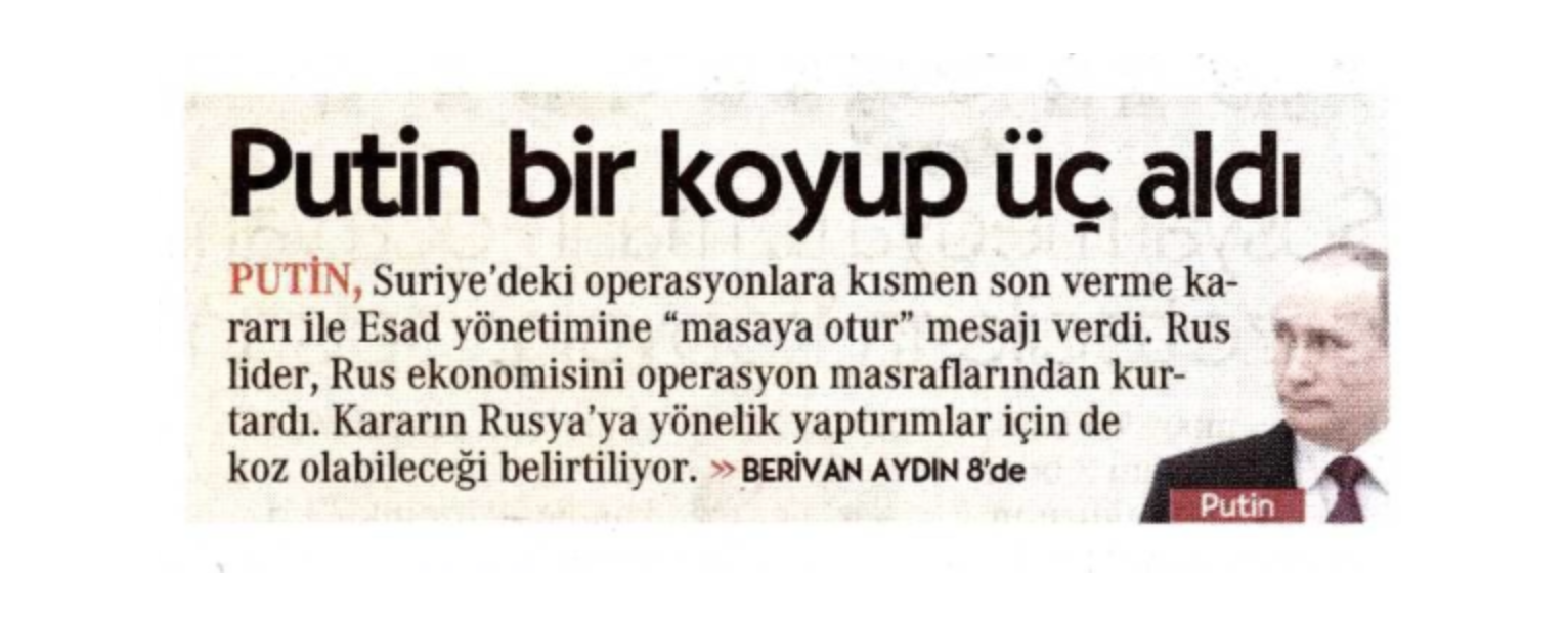Cumhuriyet gazetesi Türkiye’deki ihanet cephesinin buluşma adresi oldu. Bu yüzden FETÖ ve PKK terör örgütlerinin sesine dönüştü. Sadece Türkiye’ye düşmanlık ediyor, bir müstemleke tetikçi gibi yayınlar yapıyor. Türkiye aleyhindeyse terörist olması farketmez Cumhuriyet için makbul ve itibarlı isimlere dönüşüyor. İşte Suriye’den defolup çıkan Rusya’ya bugünkü nüshasında övgüler dizen Cumhuriyet, Putin için “İstediğini aldı gitti” haberi yaptı. Hiçbir tarafsız veriye dayanmayan haber, Türkiye düşmanlığı adına kurgulanmış tamamen ihanet dolu metinden ibaret… Cumhuriyet’in terör örgütlerinin yayın organı olması bir kenara Türkiye’ye savaş açmış bir müstemleke paçavrası olduğunu görüp, asla yaptıkları gazetecilik olarak değerlendirilemez….