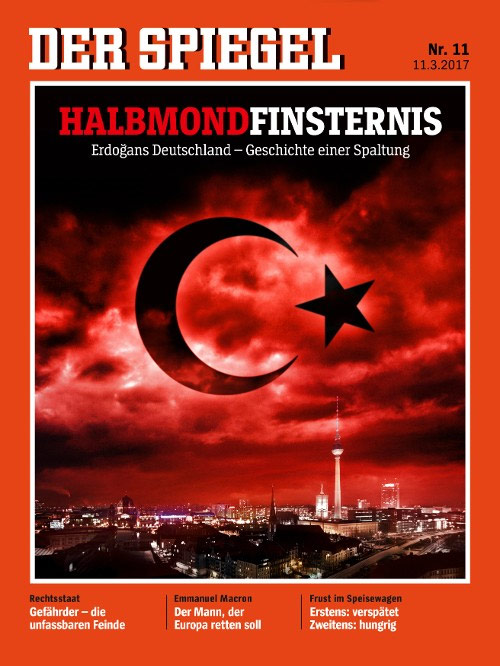 Kapaktan “Hilal Karanlığı” başlığı ve “Erdoğan’ın Almanya’sı: Bir Bölünmenin Öyküsü” alt başlığıyla çıkan dergide, Federal Almanya’daki Erdoğan siyasetinin etkilerine geniş yer ayrıldı. Türkiye’deki referandum cepheleşmesinin Almanya’ya taşınarak, buradaki göçmenlerin yaşamını iyice kararttığını ileri süren Der Spiegel, referandumun göçmenler arasındaki saldırgan eğilimleri kışkırttığını ve özellikle Türkiye kökenli insanları Almanlara iyice yabancılaştırdığını iddia etti.