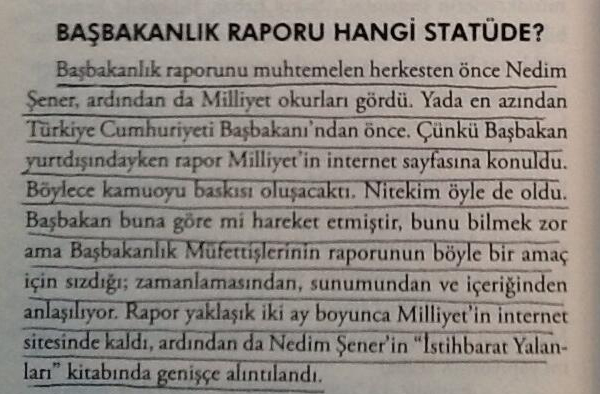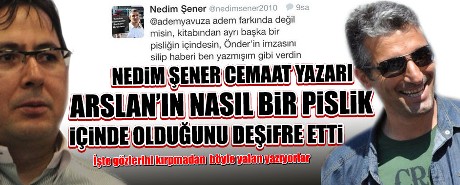 İşte bu detayın yalan olduğunu Nedim Şener Twitter’da anlattı. Başbakan’ın 2.12.2008’de imzaladığı raporu 15 Ocak 2009’da yayınlamasına rağmen “Başbakan’dan önce o raporu gördün” diyen Adem Yavuz Arslan’ın ikinci bir yalanını da deşifre eden Şener, “Pisliğin içindesin” diyerek cemaat yazarı Arslan için bakın neler neler yazdı: