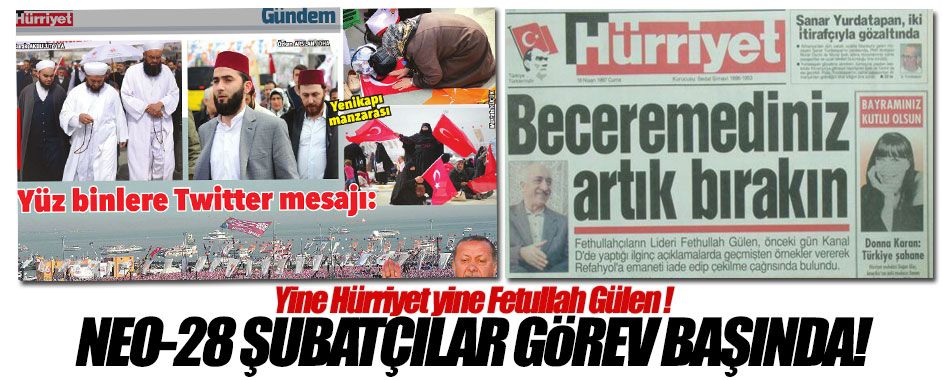 Bugün Gülen’e “çalışan” Hürriyet, yani paralel medyanın Doğan grubu ayağı, dün AK Parti’nin 2 milyon kişinin toplandığı İstanbul mitingini haberleştirdiği sayfalarında yine “28 Şubat tarzı” detaylara yer verdi, tıpkı 28 Şubat darbesinde olduğu gibi “şeriat geliyor” algısı oluşturmaya çalıştı.