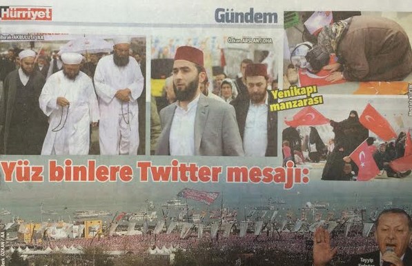 Mitinge gelen kalabalık arasında her kesimden insan vardı ama Hürriyet gazetesi “tek tip insanların bu mitinge katıldığı” algısı oluşturmak için elinden geleni yaptı. Gazetenin iç sayfalarında mitinge gelen cübbeli, tesbihli, fesli ve sarıklı insanlar öne çıkarılarak haber sunuldu. Hürriyet, AK Parti’nin mitinglerine katılanların ve bu partiye oy veren kesimlerin “şeriat” yanlıları olduğunu(!) kendi okurlarının gözüne soka soka göstermek istedi.
