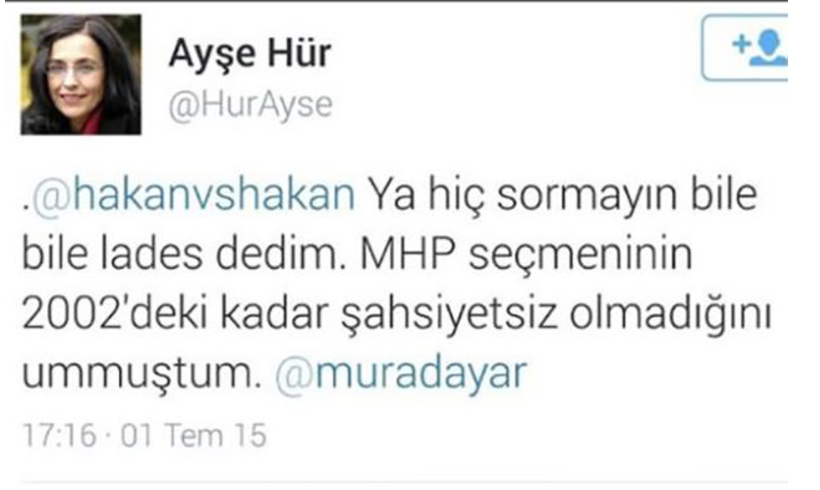 Dün yapılan Meclis Başkanlığı seçiminin sonucunda Ayşe Hür’ün “sönük bir figür” dediği İsmet Yılmaz Meclis Başkanı oldu. Ayşe Hür, sonuçların belli olmasının ardından MHP seçmeni için ağır konuştu. “Hiç sormayın bile bile lades dedim” diyen Hür, “MHP seçmeninin 2002’deki kadar şahsiyetsiz olmadığını ummuştum” ifadesini kullandı.