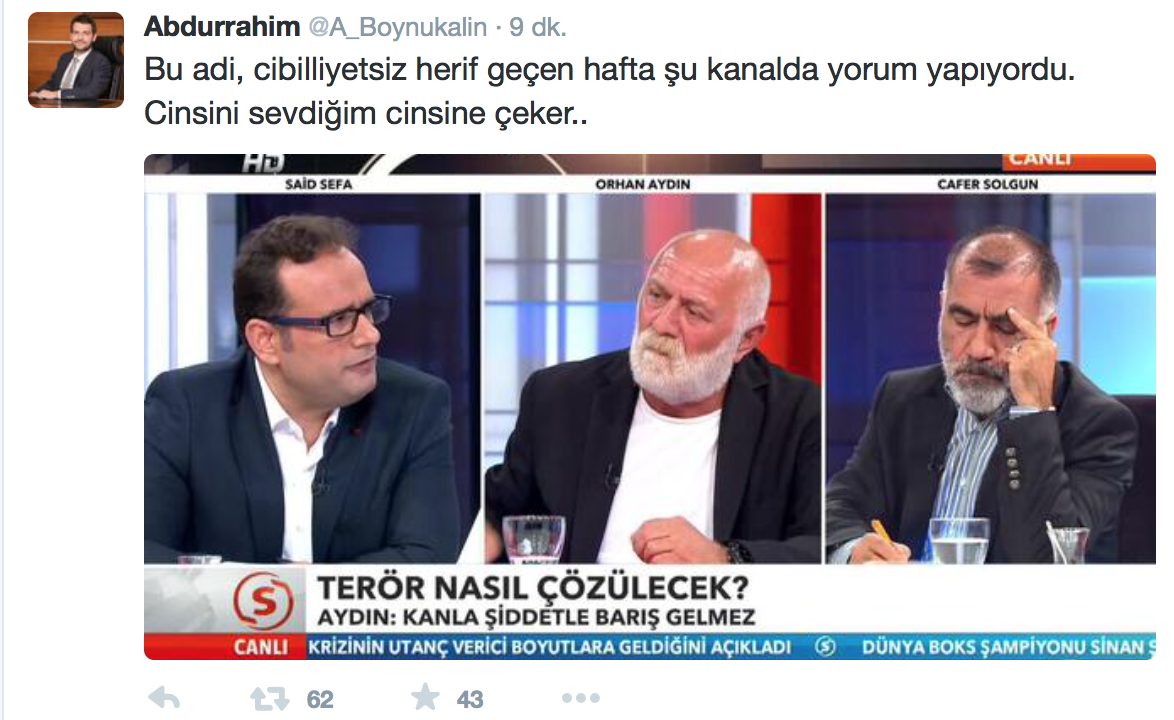 Nerede aşağılık bir iş varsa altında Fetocu terör örgütü çıkıyor. O kadar namussuz, şerefsiz ve kahpeler ki, çoluk çocuk, kadın, eş demeden saldırıyorlar. İşte Cumhurbaşkanı Erdoğan’ın kızı Sümeyye Erdoğan hakkındaki aşağılık iftira… CHP’deki Fetocu milletvekili Mahmut Tanal’ın sözde soru önergesi bile yaptığı aşağılık iftira için sözde tiyatro oyuncusu Orhan Aydın’ın yaptığı iğrenç yorum… İşte tüm bu iğrençliklerin buluştuğu tek adres Fetocu terör örgütü… Sümeyye Erdoğan hakkında o rezil tweeti atan Orhan Aydın’ın daha geçen hafta Fetocuların Samanyolu TV’sinde programda ağırlandığı ortaya çıktı.