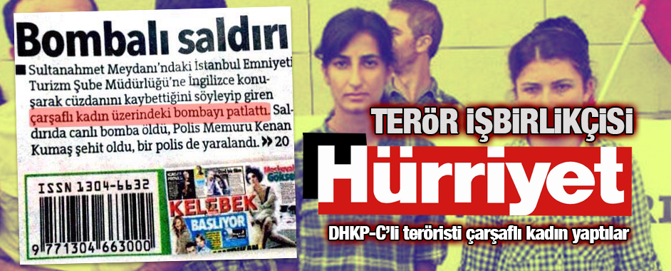 Siyah bir elbise ve kapüşon takan DHKP-C’li terörist için “çarşaflı kadın” diyen Hürriyet daha sonra bu ifadeyi son baskıda değiştirse de, gazete Türkiye’nin dört bir yanına “çarşaflı kadın” yazılı olarak gitti.