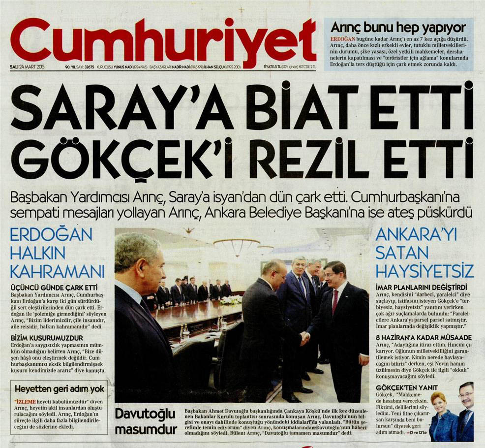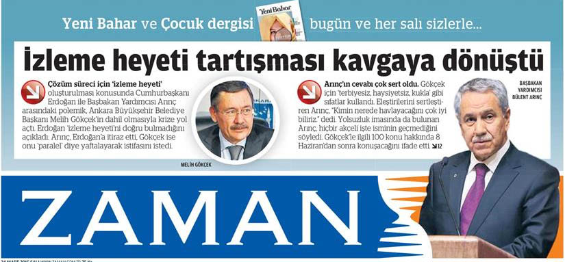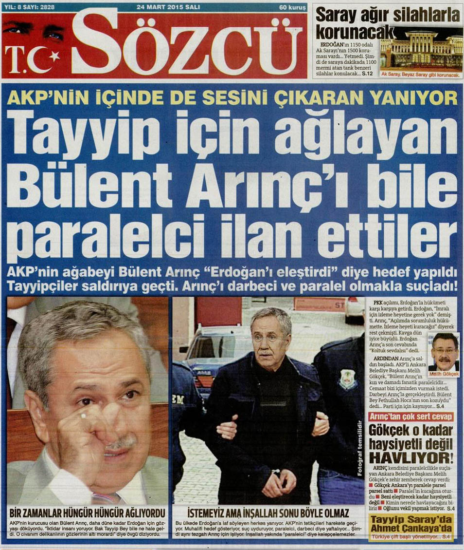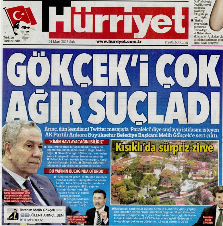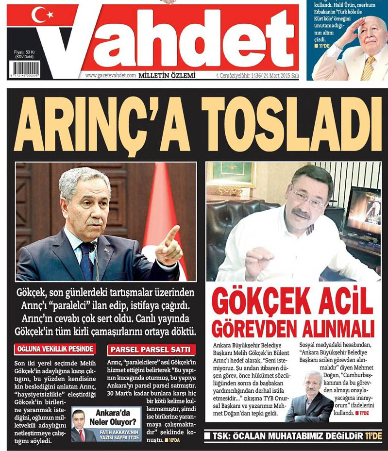 Başbakan Yardımcısı Bülent Arınç ile Ankara Büyükşehir Belediye Başkanı Melih Gökçek arasındaki tartışmayı kızıştırmaya için paralel örgüt kontrolündeki medya yine sahnede… Gülen örgütünün medyası, Doğan medyası resmen Arınç ile Gökçek arasındaki tartışmadan fitne oluşturmak için yarışa girdiler…