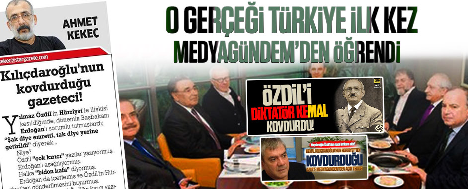 Star gazetesinde Ahmet Kekeç bugün “Kılıçdaroğlu’nun kovdurduğu gazeteci” başlıklı yazısında Yılmaz Özdil’i Hürriyet’ten CHP Genel Başkanı Kemal Kılıçdaroğlu’nun kovdurduğunu yazdı. Kekeç “Şimdi aldığım bir ‘bilgi’yi aktarıyorum” diyerek detaylarını yazdı. Kekeç’in “bilgi”sini iki yıl evvel MEDYAGÜNDEM yazmıştı. Özdil’i Hürriyet’ten Kılıçdaroğlu’nun kovdurduğunu ilk kez yazan MEDYAGÜNDEM idi. Kılıçdaroğlu’nun kovdurduğu gazeteci sadece Özdil de değildi. Diğerlerini de MEDYAGÜNDEM yazdı. İşte Kekeç’in yazısındaki o bölüm…