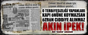 MEDYAGUNDEM.COM- Başbakan Erdoğan’a bir “fotoğraf operasyonu” ile namertçe ve kalleşçe terbiyesizlik yapan Akın İpek’in sahibi olduğu Bugün gazetesinin peşini Yeni Akit bırakmıyor. Dün “cemaatin Sözcü’sü olmak için çırpınan ahlaksız gazete” diyen Akit, bugün de Akın İpek’in ve gazetesi Bugün’ün peşini bırakmayacağını açıkladı.