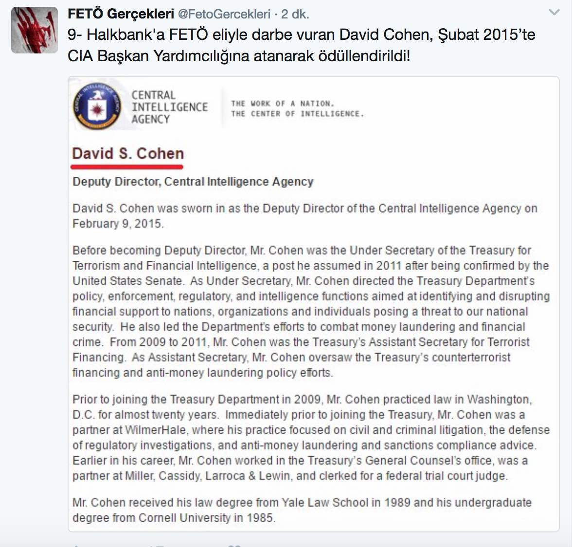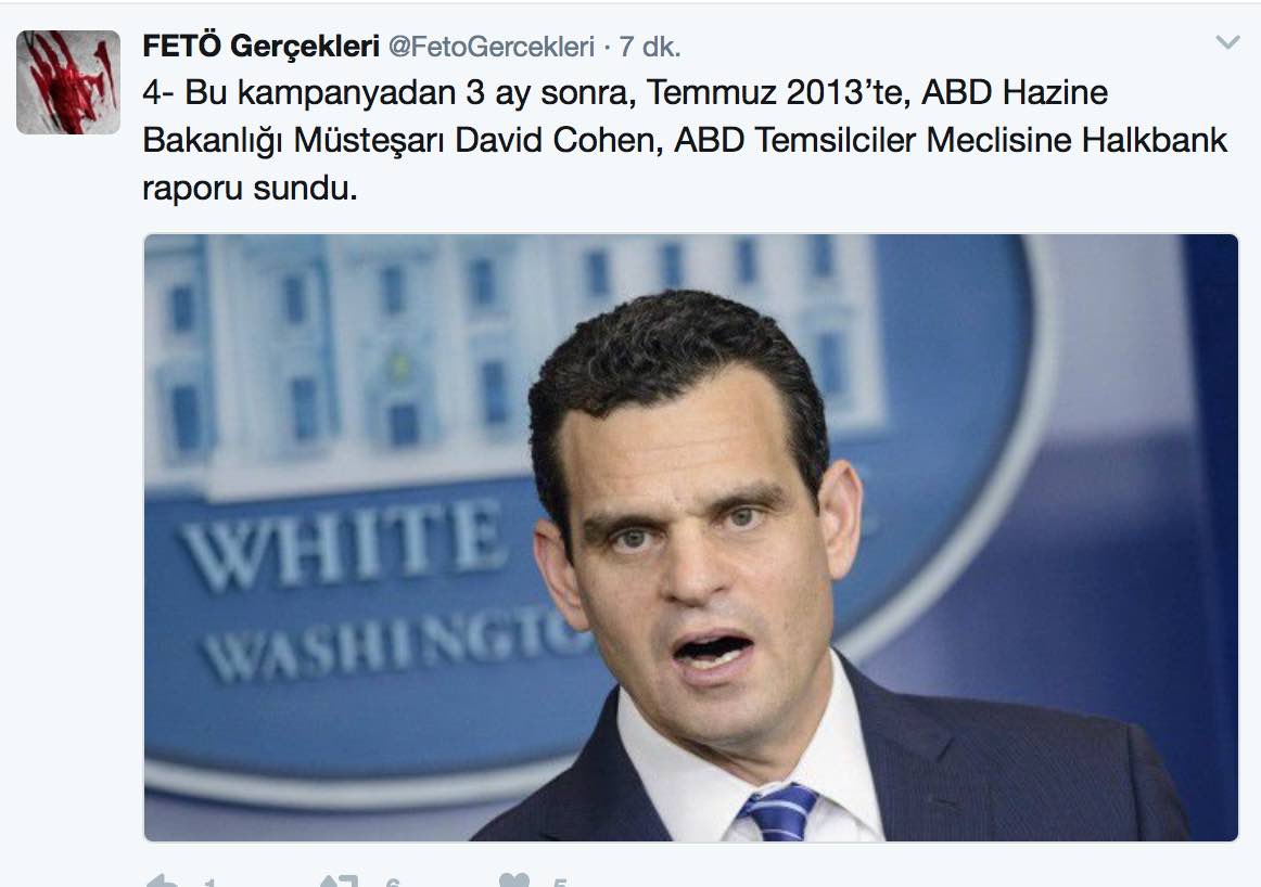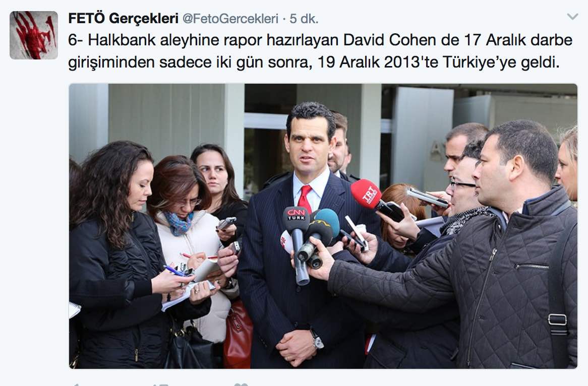 Cohen, raporunu okuduktan sonra Temsilciler Meclisine bir konuşma yaptı: “Sizi temin ederim, çok dikkatli bir şekilde dışarıdan İran’a kimlerin altın sattığına dair deliller buluyoruz.” ABD, ambargo bahanesiyle, emniyet ve yargı bürokrasisine sızan FETÖ’cüler üzerinden 17 Aralık operasyonuna girişti. David Cohen de operasyondan tam 48 saat sonra Türkiye’ye gelmişti.