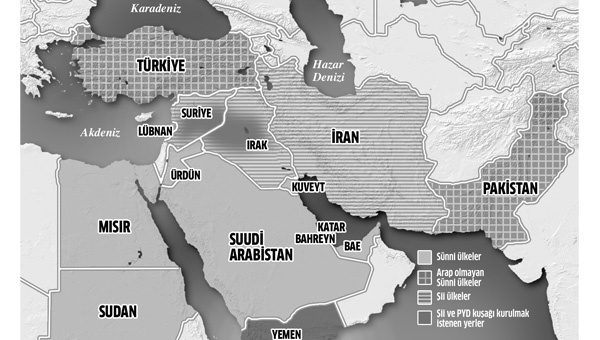 Harita’daki en dikkat çekici nokta, ‘Sünni’ olarak belirtilen Sudan, Mısır, Suudi Arabistan, Birleşik Arap Emirlikleri, Katar, Ürdün ile yine ‘Sünni’ olarak dikkat çekilen Türkiye ve Pakistan arasında üç ‘Şii ülke’ yer aldığına vurgu yapılması. Stratfor’a göre, Suriye ve İran, nüfusları itibariyle ‘Şii’ iki ülke. Aynı şekilde, Yemen’de bir ‘Şii’ ülke olarak yer alıyor ve Suriye ve Irak’ta Türk sınırına yakın noktalardaki Musul ve Halep’te ‘Çatışma alanı’ olarak gösteriliyor.