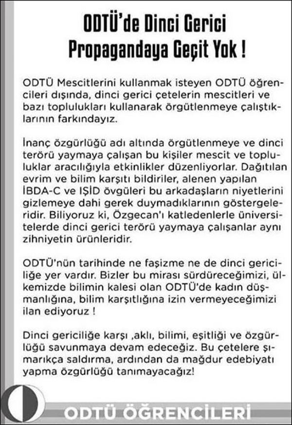 ODTÜ’de yaşanan bu olaylardan sonra ODTÜ’de bazı öğrenci grupları bir bildiri yayınladı. Yayınlanan bildiride ODTÜ’de dinci gerici propagandaya geçit olmadığını belirtti.