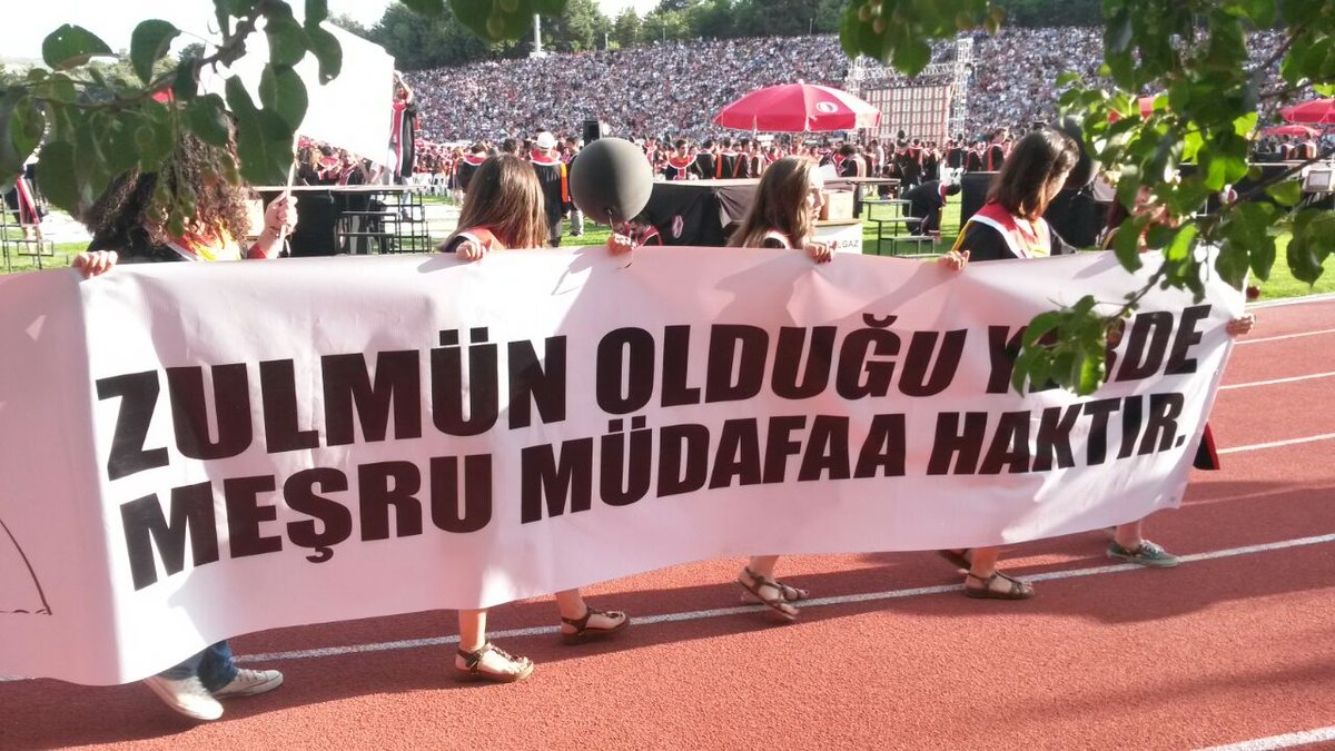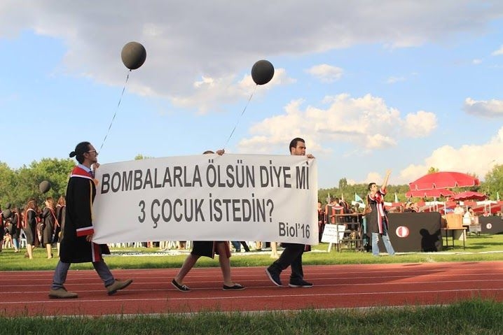 Eğitim ve başarı dışındaki konularla gündeme gelen Ortadoğu Teknik Üniversitesi öğrencileri bu yıl da mezuniyet yürüyüşünde hazırladıkları pankartlarla ülkelerinden yana olmadıklarını gösterdiler.