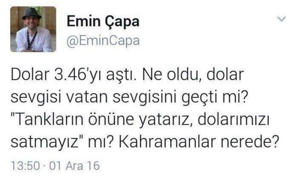 Emin Çapa, bir süre önce 15 Temmuz şehitleri ile dalga geçen tweetleri nedeniyle büyük tepki toplamış ve tweetini silmek zorunda kalmıştı.