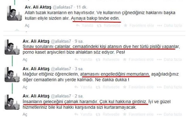 Dün gece yarısı yapılan casusluk soruşturması sonrasında, cemaat medyası eski şube müdürü Hayati Bağdaş’ın kameralar önünde söylediği “Haram lokma yemedim” sözüne avukat Ali Aktaş, twitter üzerinden kapak gibi şu yorumları yaptı: