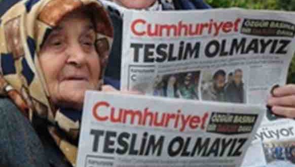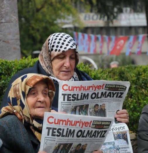 Cumhuriyet gazetesi için destek nöbetleri tutanlar, başörtülü teyzelerin ellerine gazeteleri tutuşturarak fotoğraflarını çekti.