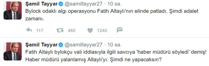 Fatih Altaylı’nın Boylock odaklı bir algı operasyonu yaptığını söyleyen Tayyar, “Bylock odaklı algı operasyonu Fatih Altaylı’nın elinde patladı. Şimdi adalet zamanı.” şeklinde konuşarak yargıyı Fatih Altaylı’ya karşı göreve çağırdı.