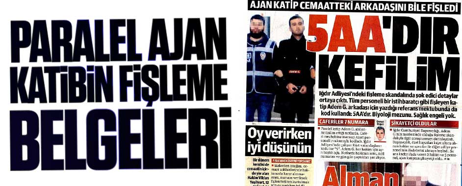 Ele geçirilen belgelerde dikkat çeken notlardan birisi ise Adem G.’nin bir kişiye referans olması. Belgede referans olmak istediği arkadaşının adı, soyadı ve TC numarası yazıyor. Onun yanında da arkadaşıyla ilgili diğer bilgilere yer veriyor. Arkadaşının Biyoloji mezunu olduğunu, Şanlıurfa Viran şehrinde imamlık yaptığını belirtmiş. Dikkat çeken başma bir ifade ise arkadaşından ‘5AA’dır şeklinde bahsetmesi. Arkadaşının herhangi bir sağlık engelinin olmadığını belirten Adem G. referans olarak da kendisini gösteriyor. Ancak bunu, kurum sicil numarası ve başına 5 ekleyerek belirtiyor. Adem G.’nin fişlemeleri yaparken A4 kağıtlarının sol üst köşesine kurum sicillerini yazıyor ve numaranın başına da 5 ekliyordu. Bu durum Adem G.’nin referans olduğu arkadaşını gönderdiği kişinin paralel yapının mensubu olduğunu da ortaya koyuyor. (YENİ ŞAFAK)