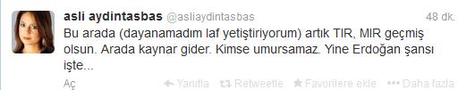 “Bu arada (dayanamadım laf yetiştiriyorum) artık TIR, MIR geçmiş olsun. Arada kaynar gider. Kimse umursamaz. Yine Erdoğan şansı işte…”